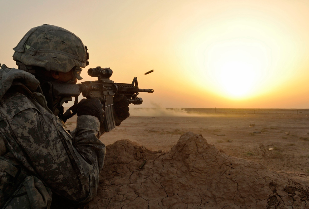 35. Солдат из подразделения «Браво» прикрывает товарищей во время тренировки на военной базе Киркуш, провинция Дилая, 10 июня. Американские и иракские солдаты учатся обезвреживать мины и проходить препятствия, проводить операции по зачистке бункеров и вступать в контакт с местными жителями. (U.S. Army/Petty Officer 2nd Class Ted Green)