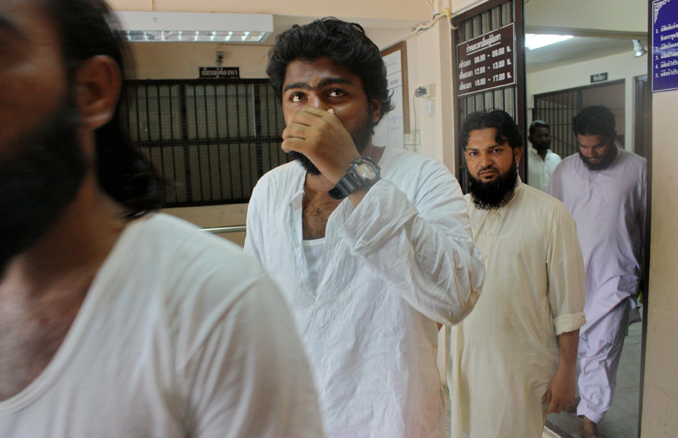14. Задержанные пакистанцы идут по полицейскому участку в южном городе Яла 13 октября, на следующий день после их ареста. Полиция Таиланда сообщает, что они арестовали 15 пакистанцев, подозреваемых в финансировании подозрительных мероприятий, которые могут иметь отношение к организации терактов. (MUHAMMAD SABRI/AFP/Getty Images)