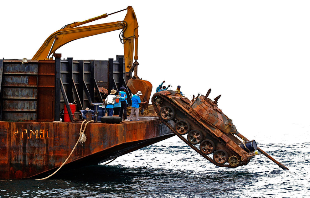 21. Рабочие сталкивают экскаватором старый танк в море в провинции Наратхиват 9 августа. 25 старых танков были привезены из Бангкока и сброшены в море в Сиамском заливе, чтобы образовать искусственные рифы для обитания различных видов рыб. (AP Photo/Sumeth Parnpeth)