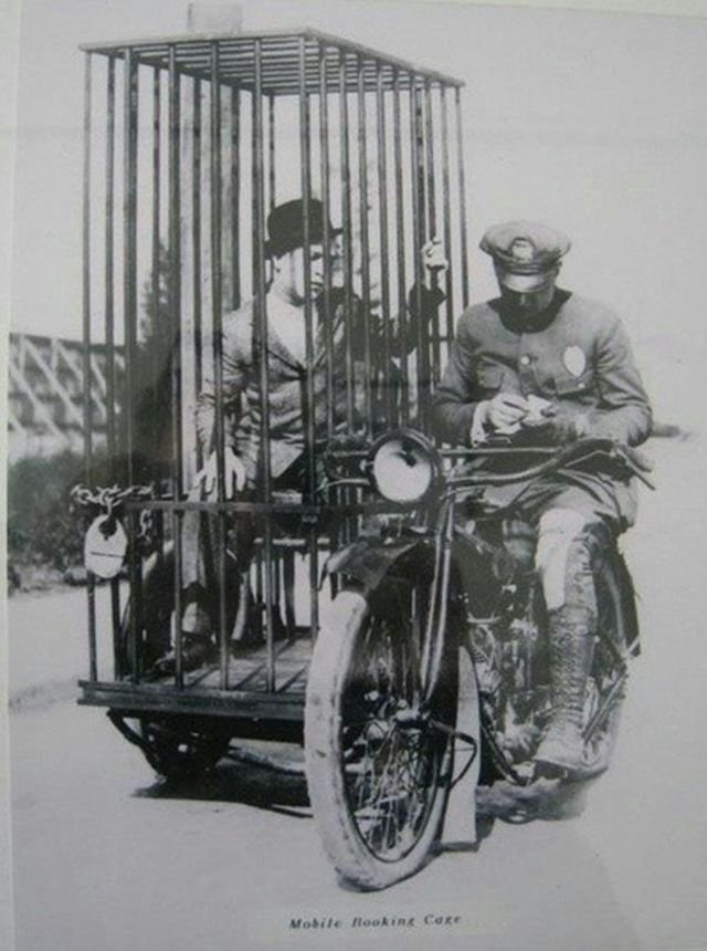 Policeman on a Harley with an old-fashioned mobile detention camera, 1921.