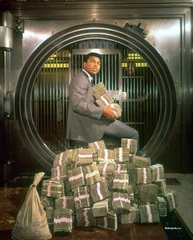 Mohammed Ali puts his victory prize money in the bank, 1974