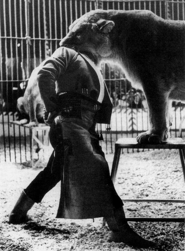 A tamer who performed a dangerous stunt in the mouth of a lion at a performance in Hamburg, 1962.