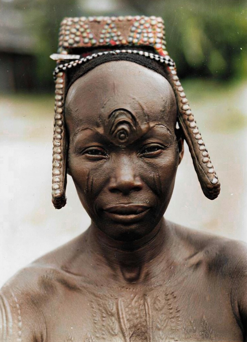 The girl’s face is the result of scarring, — special application of scars to the body, which in their finished form represent some kind of design or pattern.