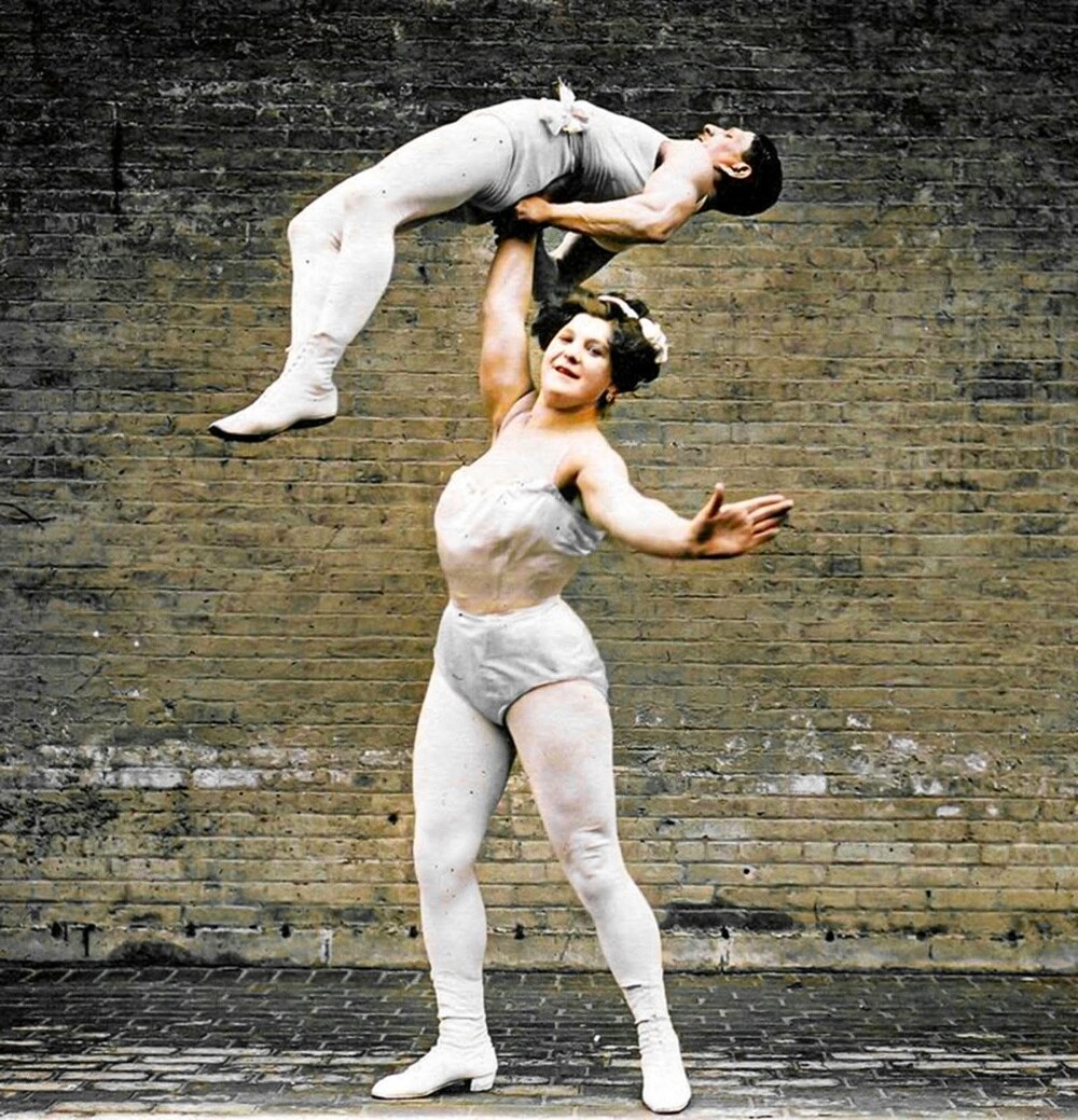 Circus strongwoman Kate Brumbach, better known as the Great Sandwina (1884 - 1952), lifts her husband above her head