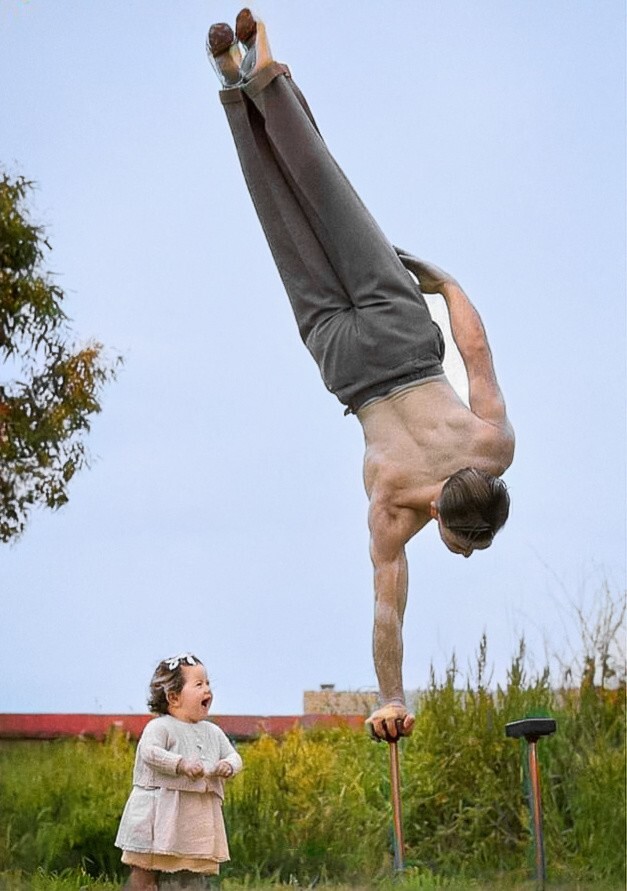 A dad shows off his skills to the surprise of his little daughter in Melbourne, Australia, 1940s.