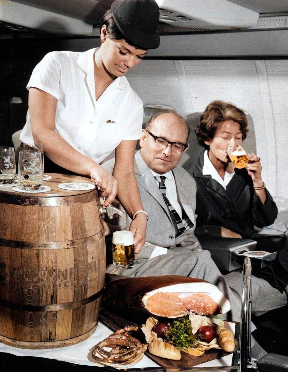In the photo, a flight attendant pours fresh draft Pilsner beer for Boeing 707 passengers. This was a tradition on Lufthansa flights in the 1960s.