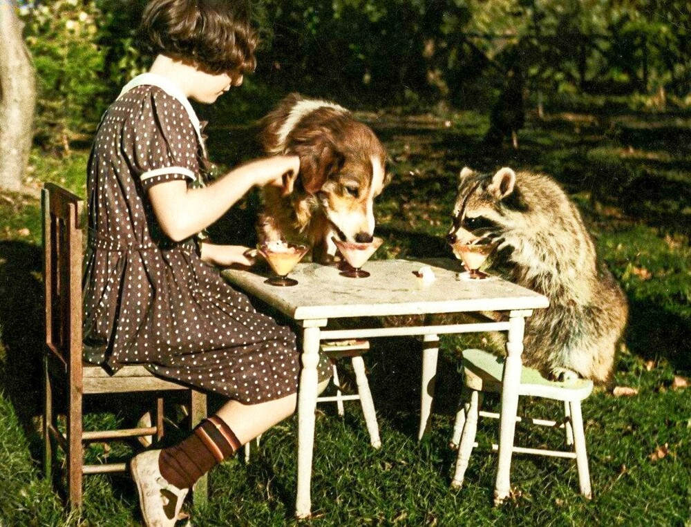 A girl eats ice cream in the company of her pets, a dog and a raccoon, USA, 1930