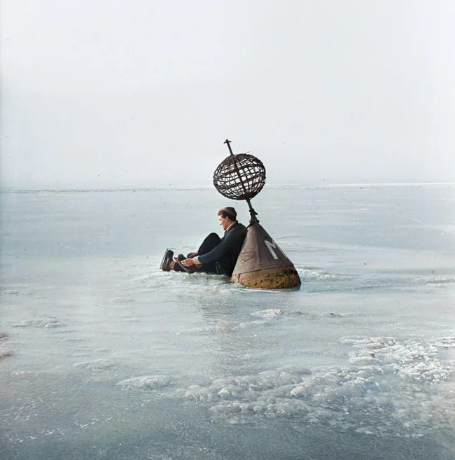 A man with skates near a buoy on Lake IJsselmeer, Netherlands.