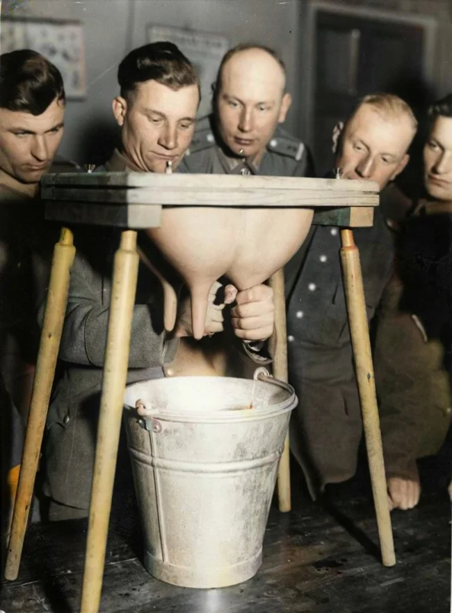 Austrian soldiers learn to milk using a special simulator at a military school, 1935.