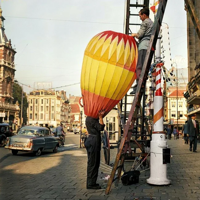 Preparing for evening lighting on Leidseplein, Amsterdam, 1956.