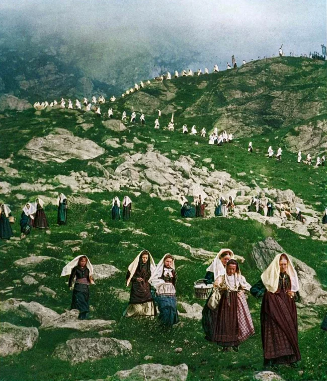 Procession from the church and monastery complex in the Alps, Italy, 1920s.