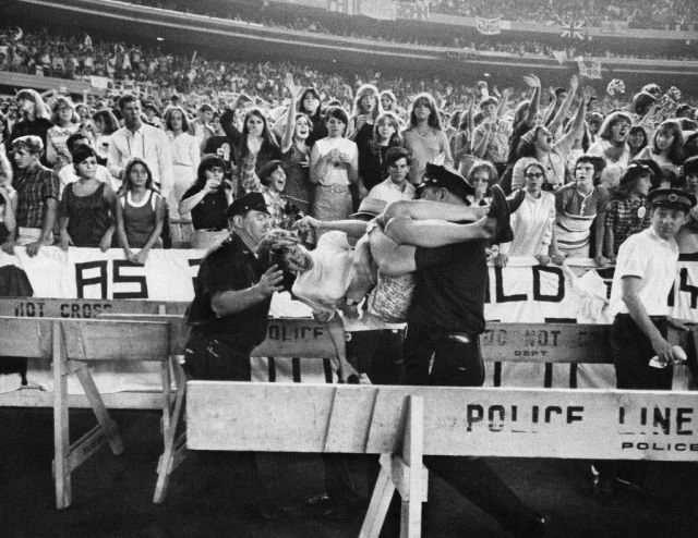 Police calm down a Beatles fan at a concert in New York, August 23, 1966.