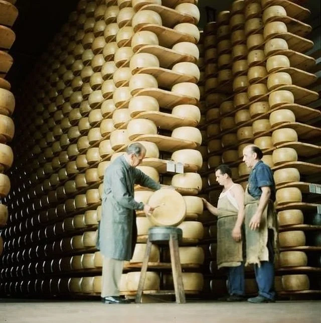 Warehouse workers check a Parmesan cheese wheel, Parma, Italy, 1960s