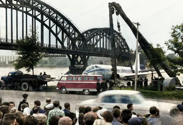 The plane, en route from Tallinn to Moscow, experienced an emergency situation—the landing gear failed to retract. The aircraft was diverted for an emergency landing in Leningrad. However, while dumping fuel over the city, both engines of the Tu-124 failed one after another. Faced with a desperate situation, captain Vasily Chechenev made the bold decision to land the plane on the Neva River. The landing was a success! Almost no one on board was injured, with the exception of a few passengers with minor injuries. The only high-quality photograph capturing this moment was taken by photographer Yuri Tuysk. Photos taken by other bystanders who attempted to capture the incredible event were confiscated by the police.