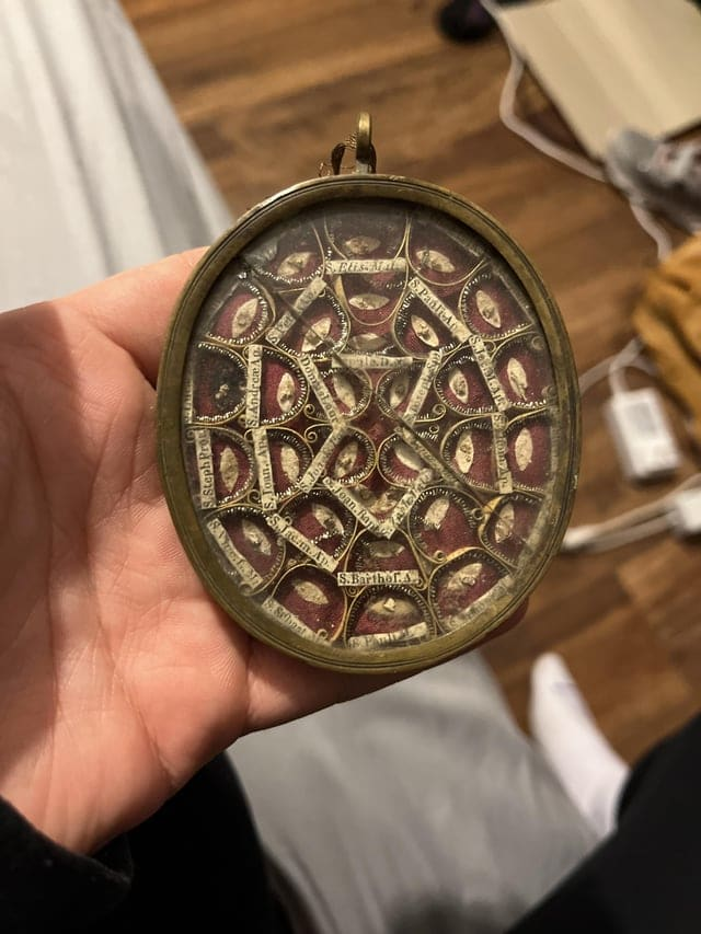 Medallion made of glass and metal. Strange notes with names are hidden inside