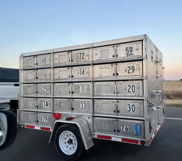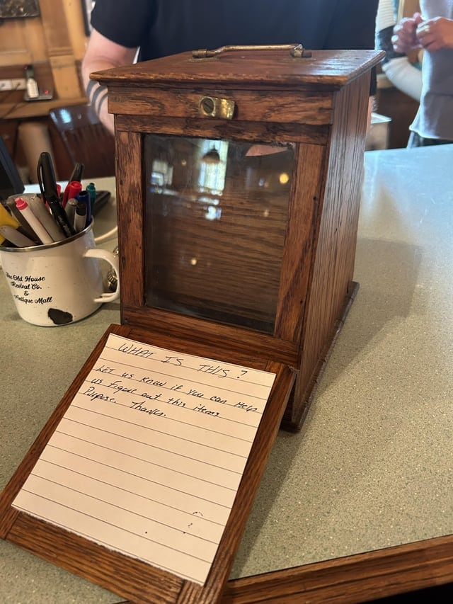 Wooden box with a glass window. Has a wooden shutter on a hinge that closes the glass