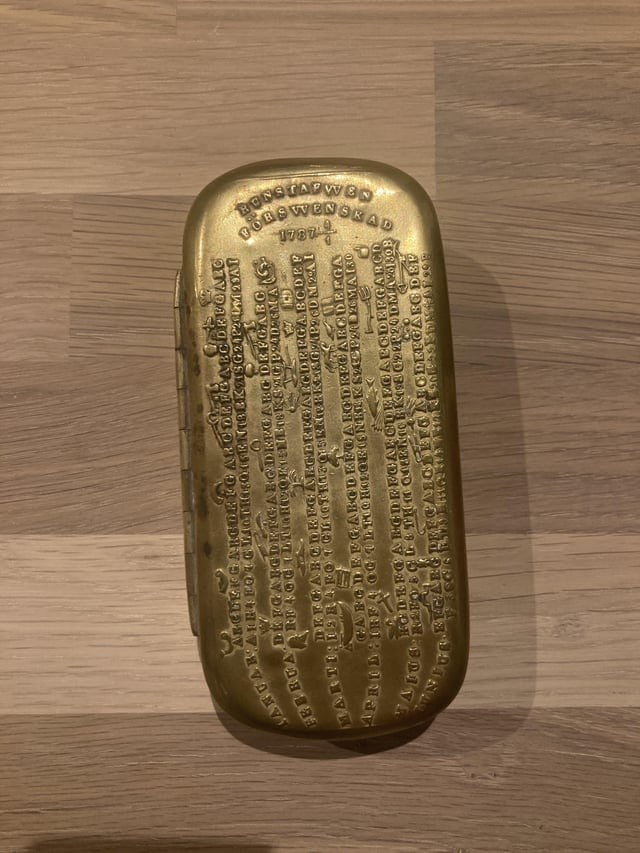 Golden box from 1787 with months on both sides followed by a series of letters and numbers. Found in the attic
