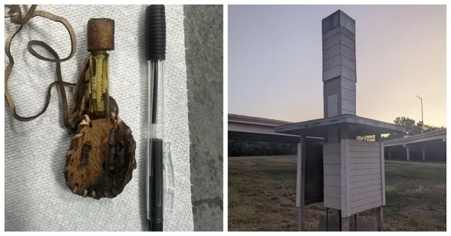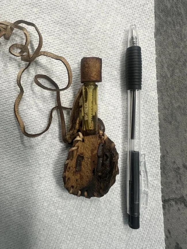 9. Found at a shipwreck. Does anyone know what this is? A small bottle of yellowish amber with a transparent liquid inside! In a leather bag on a drawstring. The length of the bottle is about two centimeters