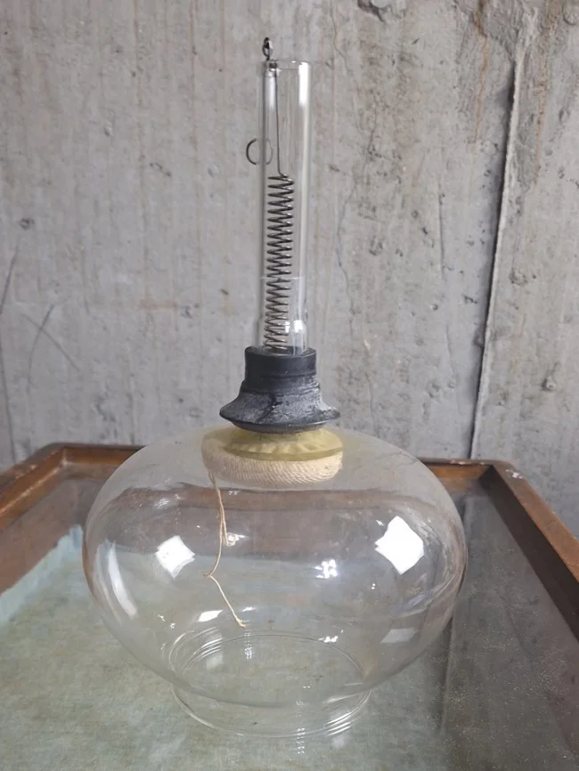 2. A small glass bowl without a bottom, the size of a tube 13 centimeters long, containing a spring attached to a fibrous liner inside the bowl. Small hole on the side of the tube