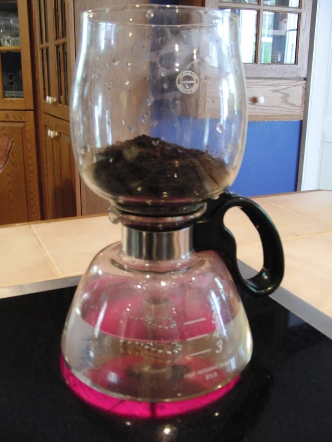 The coffee grounds are placed in the bowl, it should be inverted, with a plastic lid. The tube is lowered into a bowl of water on the stove. The water boils, pushing the spring up and filling the upper chamber, when the lower container cools, a vacuum is created that draws the coffee water through a cotton filter into the lower serving bowl, the grounds remaining at the top.