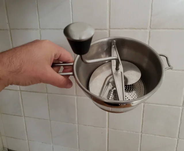 This is a food mill. It is used to make the most delicate and velvety soups.
