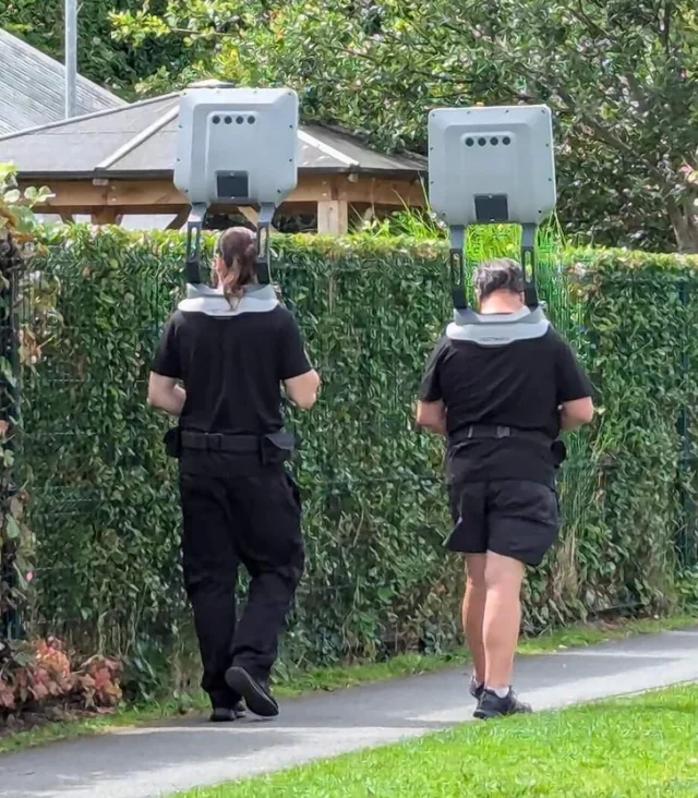 Two guys with some TVs on their shoulders. Are they scanning something?