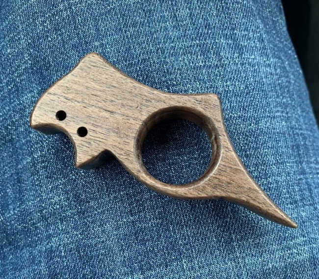 1. Found in the library. Wooden object with two small and one large hole