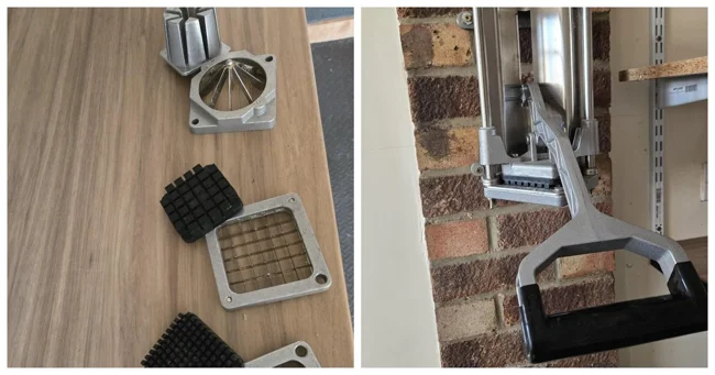 This is a commercial hanging potato cutter. It makes French fries.