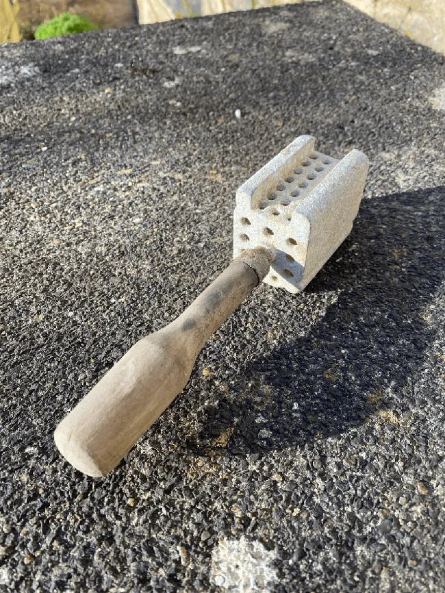 7. Found on an old farm. Stone block with holes and wooden handle