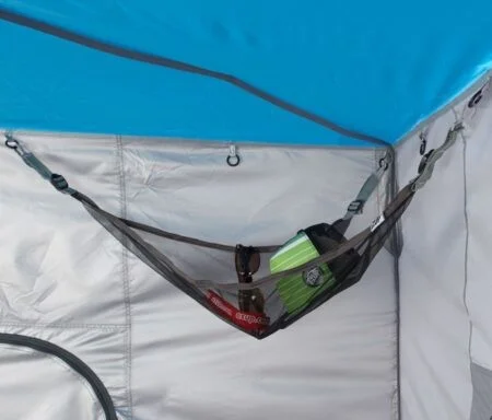 Hanging shelf for a tent.
