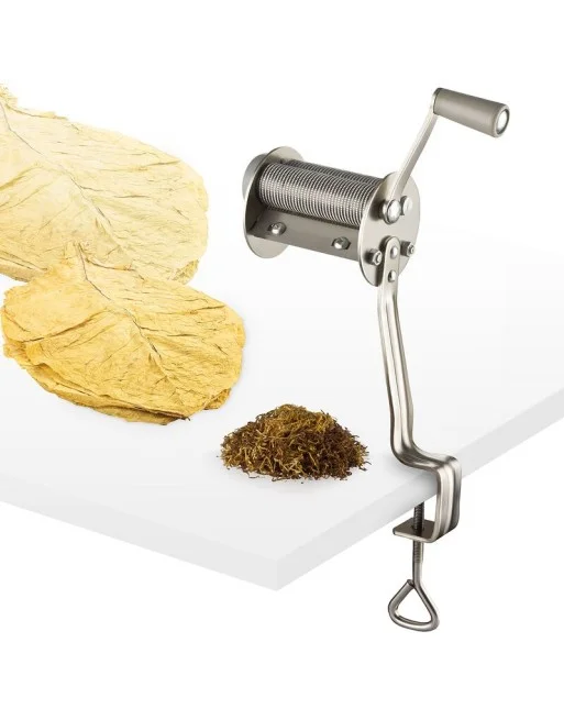 Hand-held machine for grinding tobacco leaves.