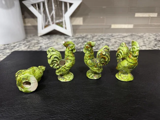 5. Small porcelain cockerels from an antique shop, 5 centimeters in size, speckled, with a hole on one side of the cockerel and at the bottom