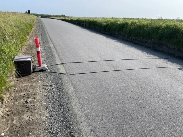 When a vehicle passes them, the counter in the box is triggered. I think since there are 2 wires on the road, it means that they check the speed. The device calculates the speed of the car by the time between the first and second wires.
