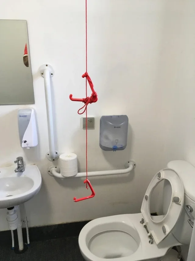 "A red cord with handles hanging from the ceiling of a gas station toilet"