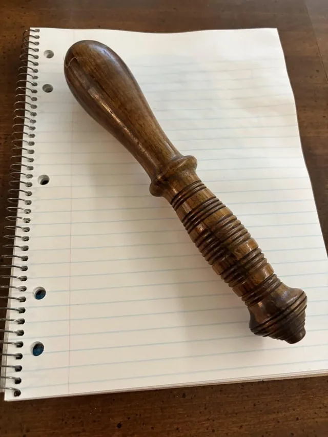 9. A metal object found in the forest by a metal detector. On one side is the inscription "RMS Aquitani" (Royal Mail Ship Aquitania), on the other side is a ruler
