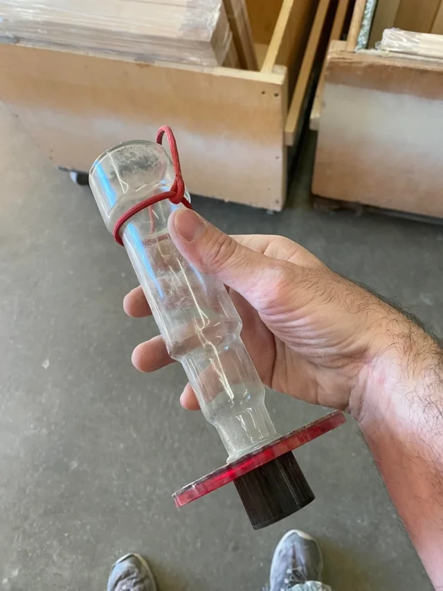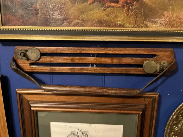 5. A wooden structure about 30 centimeters long with two brass rings and a handle, found in a pub in rural England.