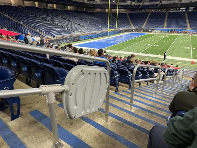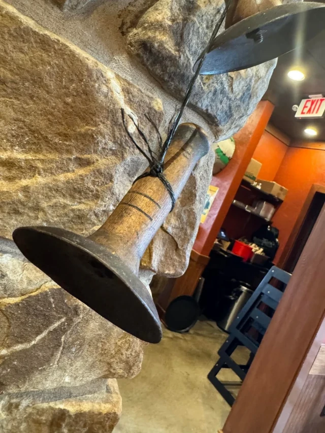 2. A concave metal disc on a wooden handle, found in a barbecue restaurant.