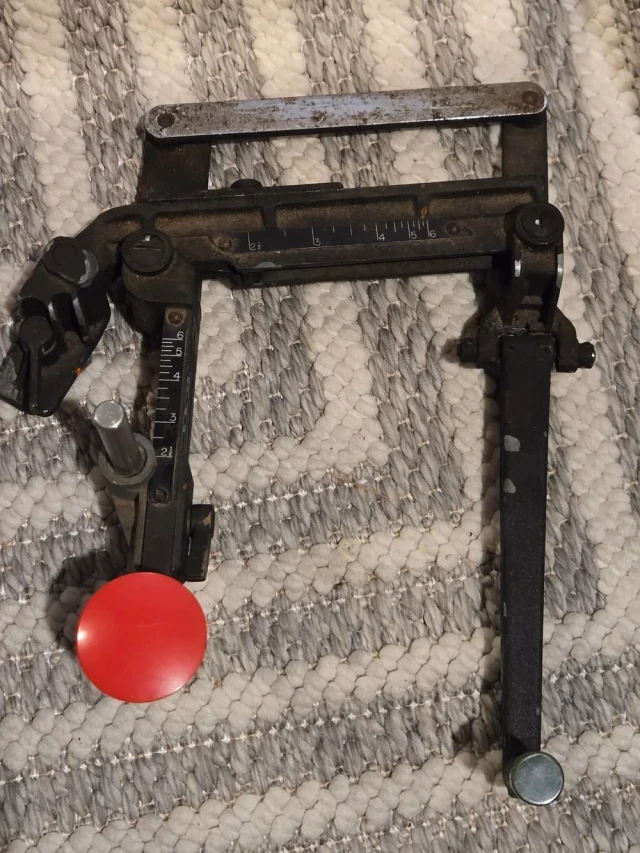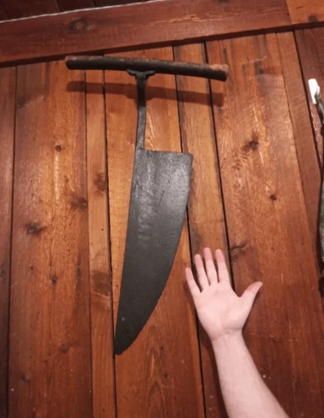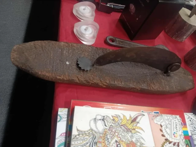 3. A metal blade on a wooden base, approximately 40 centimeters long, found at a flea market.