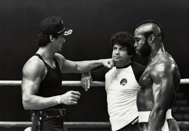 Sylvester Stallone is already in the ring and shows where to hit on the set of the movie "Rocky 3"