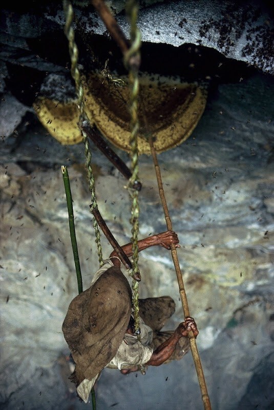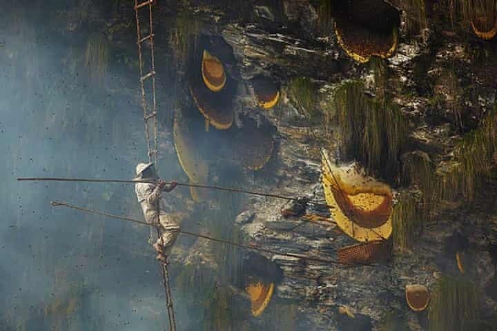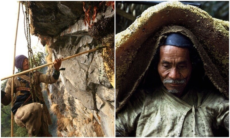 Hunters collect honey from Apis laboriosa, the largest bee honey bee in the world, individuals of which can reach 3 cm in length. They are build their hives high in the foothills, so collecting their honey is a challenge not easy. Hunters use handmade rope ladders and wicker baskets to reach the beehives. Then the nest is fumigated smoke, setting fire to the branches under it, and get the honey itself.