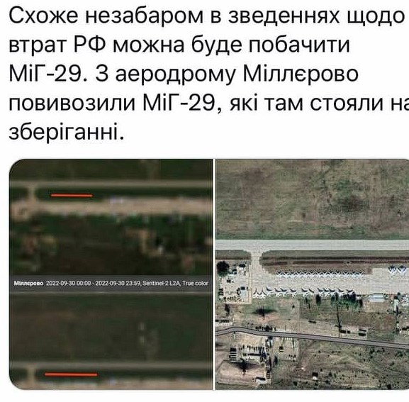 - Russia removes the storage of old aircraft. MiG-29s in storage were removed from the Millerovo airfield, analysts say, based on satellite images.