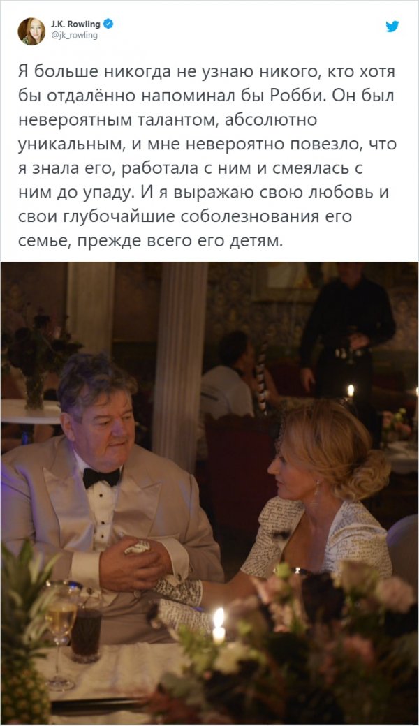 Robbie was one of the funniest people I have ever been. met, we constantly laughed. Particularly fond are the memories of how he supported us on the set of Prisoner of Azkaban, when we spent hours hiding from the pouring rain in Hagrid's hut: he told stories and joked to keep our morale up. I am very lucky that I worked with him, and very sad that he is no more. He was incredible actor and wonderful person.