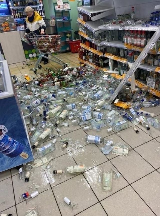 An emergency happened in one of the Moscow shops in the alcohol section. Not in able to withstand its load, the rack sent dozens of bottles of beer, vodka and other strong drinks. It was all captured on camera. observations. Ah, what a sad sight.