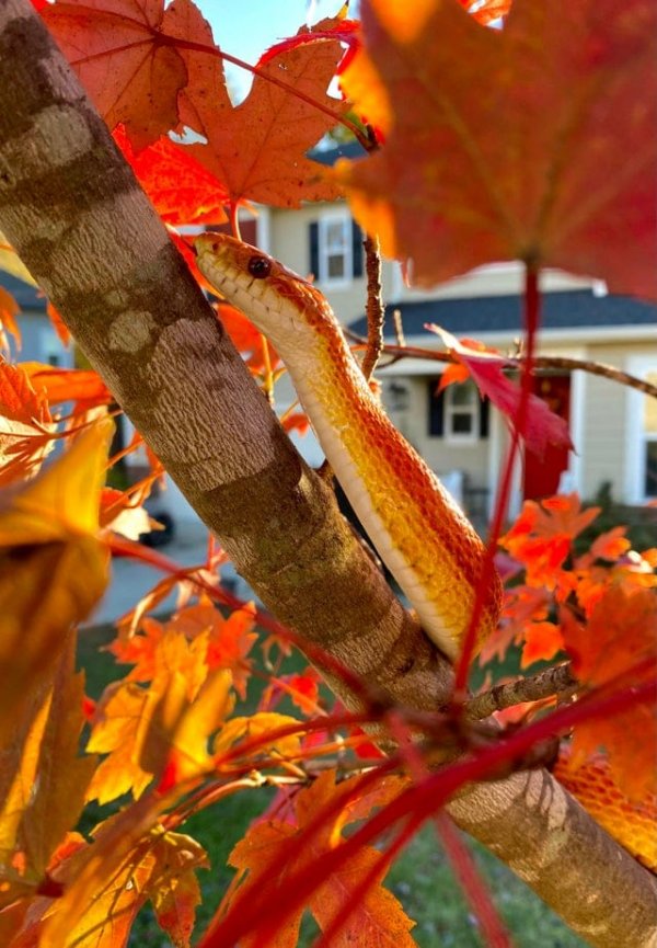 I took a picture of my pet snake. It matches perfectly with autumn leaves.