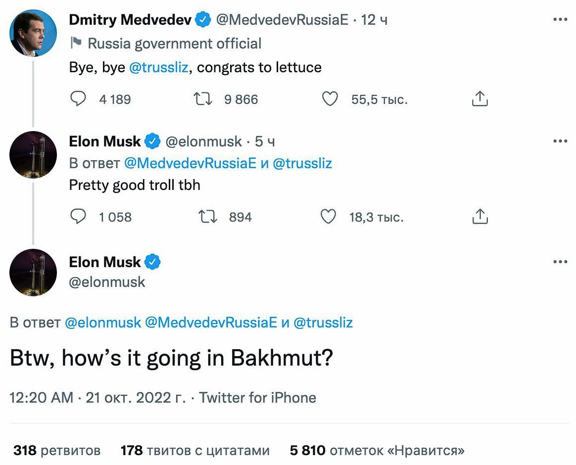 - Dear troll, how are things in Bakhmut? Although Elon Musk distinguished himself with his statements, Medvedev, who pissed off towards the Truss, trolled notably.