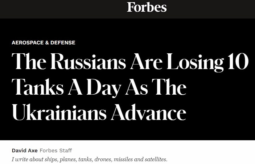 - The Russians lose an average of 10 tanks per day during the counteroffensive of the Ukrainians, while the Armed Forces of Ukraine lose only 2 tanks per day, writes Forbes.