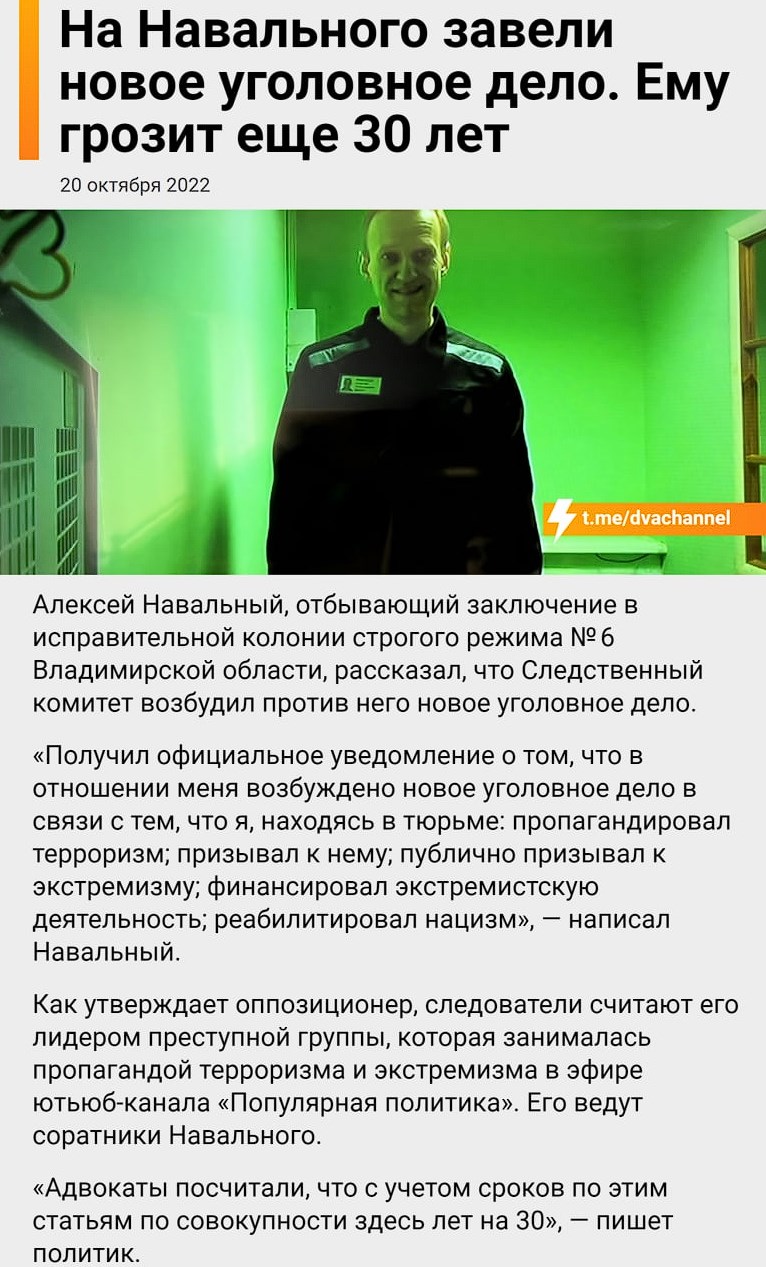 - A new criminal case was opened against Navalny. He faces another 30 years