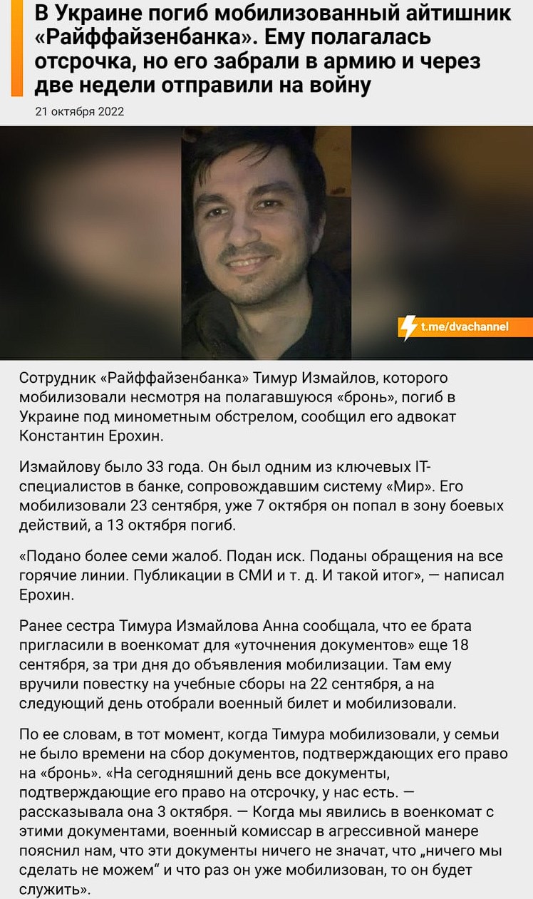 - A mobilized Raiffeisenbank IT specialist died in Ukraine. He was entitled to a respite, but he was drafted into the army and sent to war two weeks later.