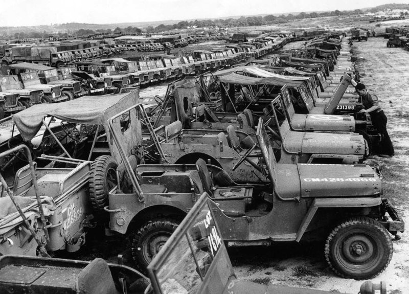 800 military jeeps are waiting for auction in a warehouse in England. 1946