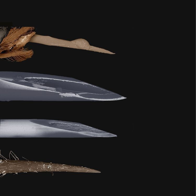 Wasp sting, hypodermic needles and rose thorn under electron microscope